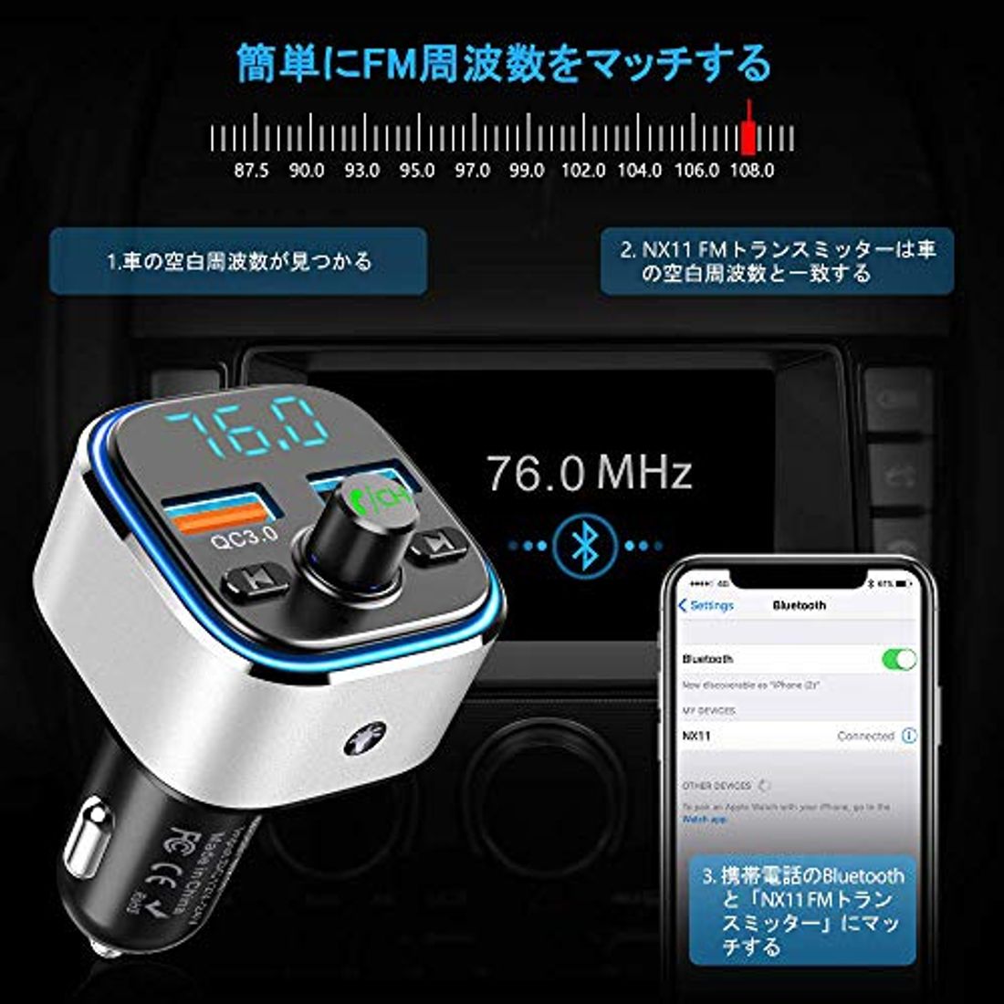 Amazoncojp FMトランスミッター Bluetooth50 車載FMトランスミッターSiri&Google Assistantに対応 7色LEDライト Android Iphone兼用充電ケーブル QC30急速充電 車載充電器 2ポート ノイズ軽減機能 TFカード USBメモリ対応 12V24V車対応 LEDディスプレイ ハンズフリー通話 バッテリー電圧チェック機能 メーカー1年 送料無料 無線 Bluetoothレシーバー ブルートゥース レシーバー カーオーディオ bluetooth 車載 音楽再生 iPhone8 iPad アンドロイド イヤホン iPhoneX スピーカー おすすめaux ケーブル 無線 bluetoothレシーバー fmトランスミッター bluetooth レシーバー 車 音楽 高音質 カーナビ bluetooth スマホ 音楽 ブルー使い方は ①ソケットに刺す ②車側をfm に ⑥トランスミッターの数字を車のラジオと同じに合わせる(車を875にしたならトランスミッターも875に) 5つ星のうち40 ブルートゥース